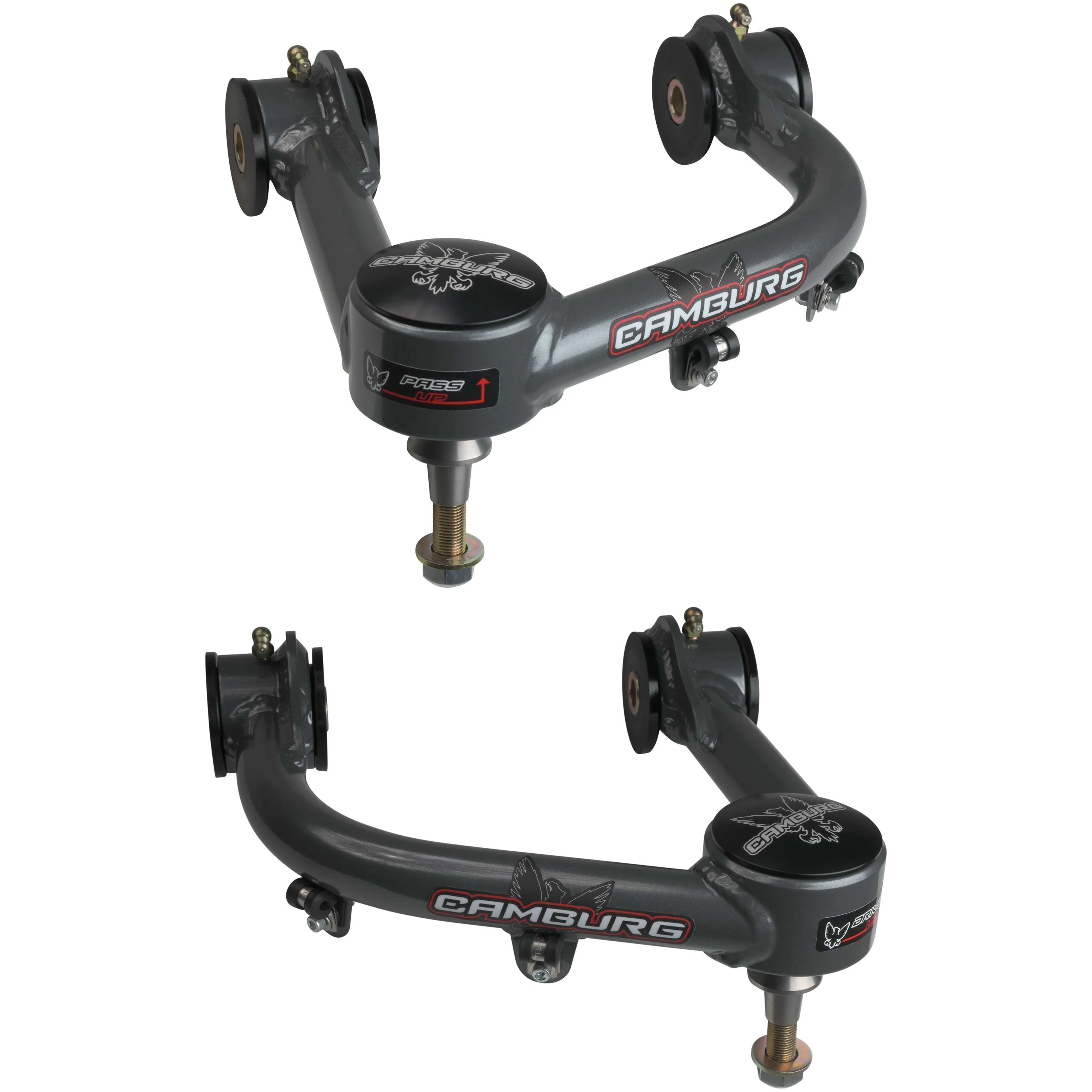 The Camburg upper arms are designed to improve the performance and durability of your truck's suspension. They feature a larger 1.25 uni-ball bearing, which increases wheel travel and provides greater strength under extreme conditions. The arms also incorporate a billet aluminum cover to protect the uni-ball from dirt and contaminants. With CAD/CAM engineering and precision manufacturing, these arms are made to strict standards. They correct camber and caster, eliminate weak factory ball-joints, and come with polyurethane frame pivot bushings with grease-able zerk fittings. The arms are made in the USA and designed for 1-3" of lift. They include uniball spacers for both aluminum and steel OEM knuckles. Please note that they are compatible with US model trucks only.