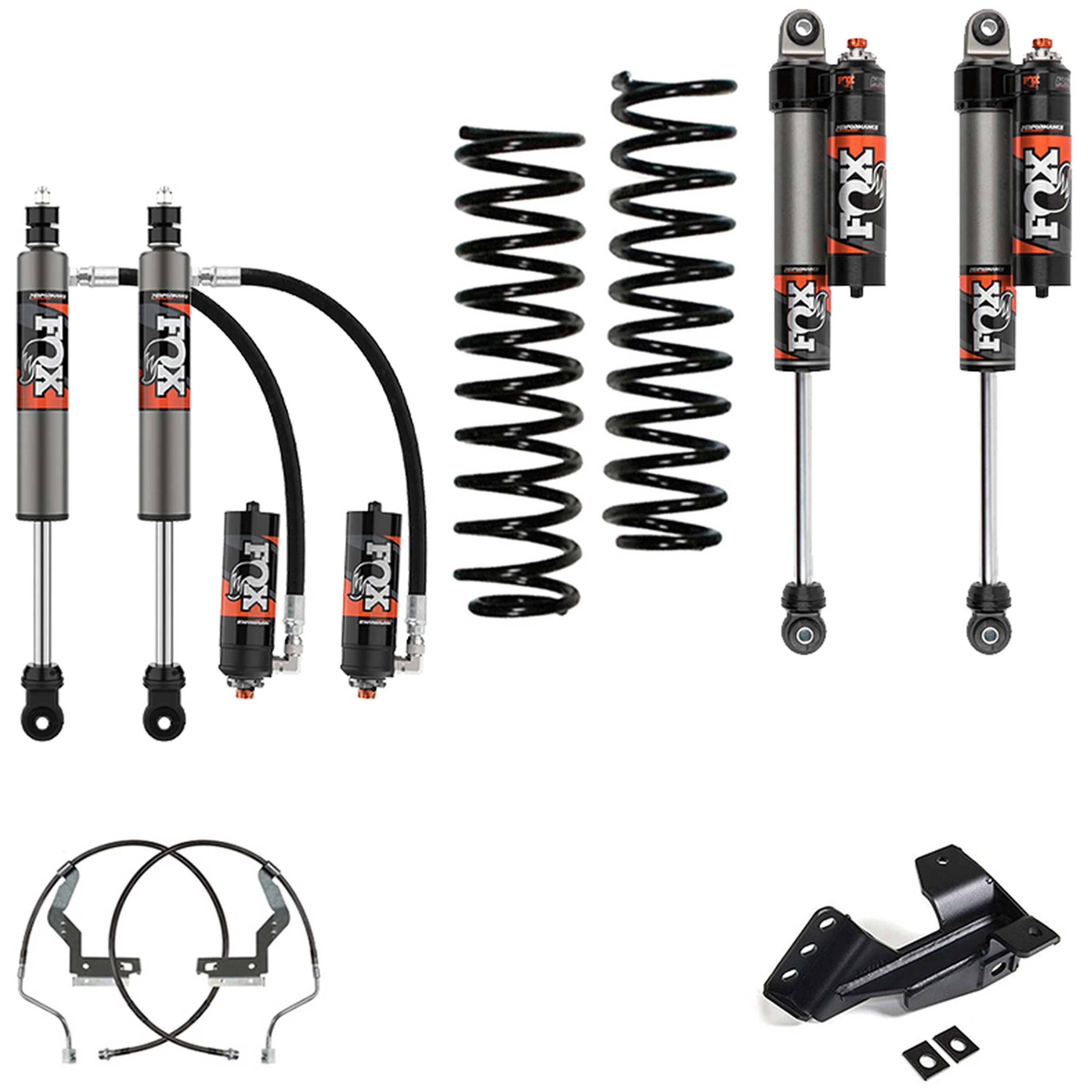 This is the ultimate way to level out the front of your 2017-2024 Ford 4WD F-250/350 Superduty and add off-road performance while fitting up to a 37" tire. This system includes FOX's NEW 2.5 Performance Elite Series DSC adjustable shocks for the front and rear that are valved for both on and off-road use and a pair of our Camburg performance coil springs. We offer a specific spring for diesel or gas engines. This easily bolts on and makes a significant improvement in the ride quality and increases wheel travel while giving you the ability to soften or firm up the ride with the DSC adjusters. We supply a front track bar bracket that repositions the track bar to correct the geometry and re-center the axle. We also include longer length stainless braided front brake lines with this kit. We highly recommend our uniball radius arms as they correct caster for improved handing and are considerably stronger than the stock versions.